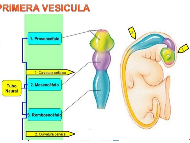 A medida que el tubo neural se desarrolla se divide en tres vesículas principales el prosencéfalo que se convierte en el cerebro anterior, el mesencéfalo y el rombencéfalo que se convierten en el tronco cerebral. Estas vesículas se desarrollan y diferencian para formar las diversas regiones del cerebro.