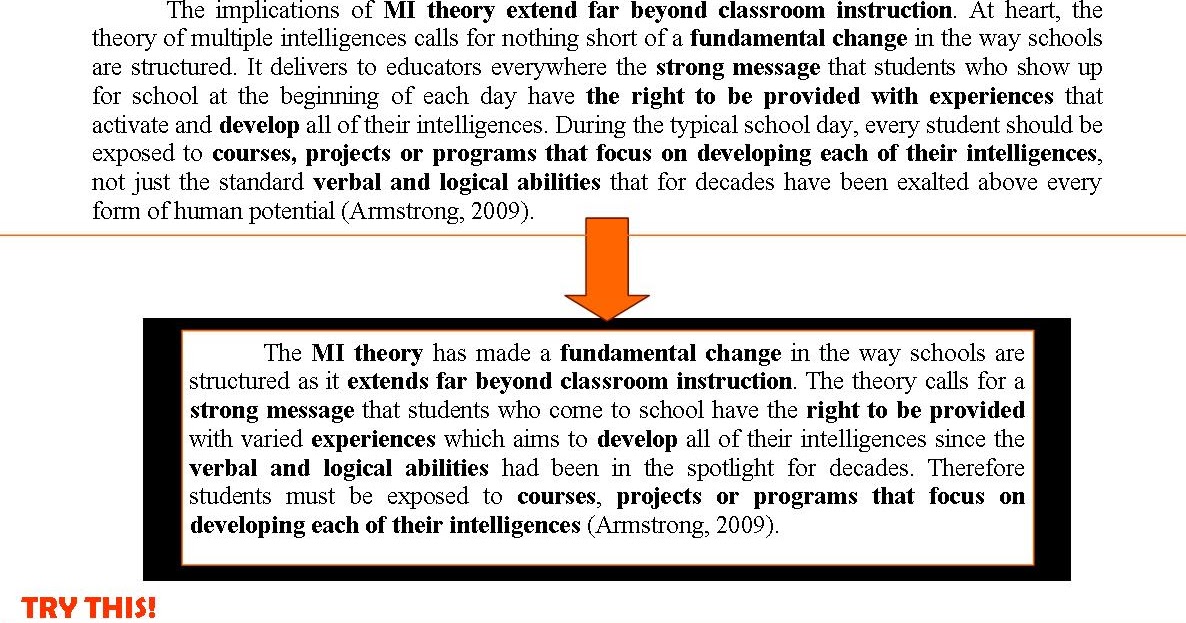 It is using your own words to express someone else's message or ideas. In a paraphrase, the ideas and meaning of the original source must be maintained; the main ideas need to come through, but the wording has to be your own.