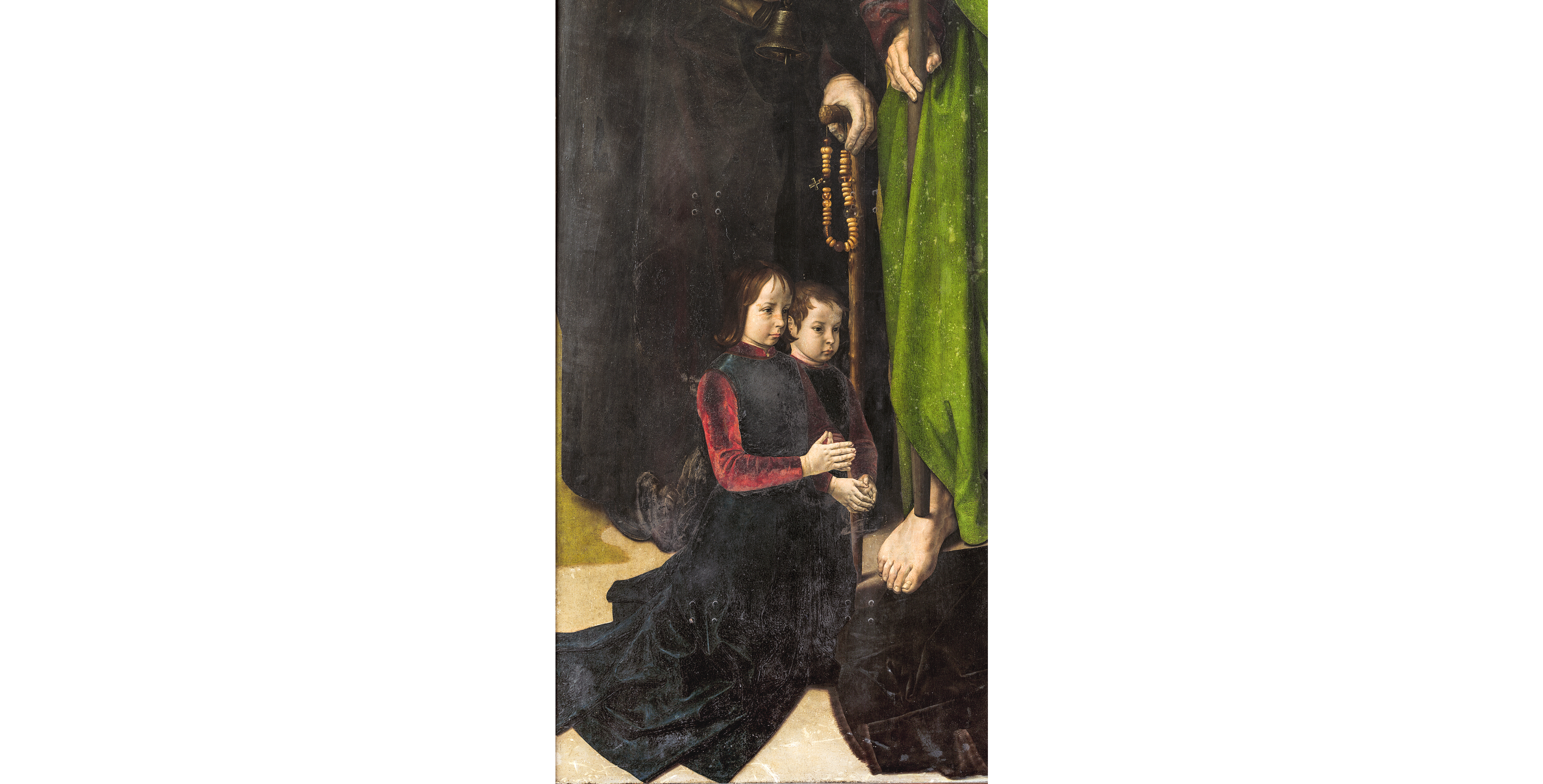 王子や王女がまだ小さい時に大きくなった時の姿を想像して描くことがある。祭壇画を描いてそこに現実の人物が、家族で登場する場合がよくある。幼児であれば一年もたてば大きくなる。祭壇画は大掛かりのものなら2,3年はかかるので、描き始めた頃の赤ちゃんも3歳になってしまっている。あらかじめ3歳になった時の顔立ちを想定して描きこむことになる。ポルティナリ祭壇画では、ポルティナリの夫婦と子どもが何人かだが、一家が総出演している。制作年がわからないのでそれを推定するのに、そこに登場する人物の知られている生没年を利用する。そこに登場する一人はあとで描き加えられた形跡がある。スペース的に狭いところに全身ではなくて兄の後ろに隠れて描かれている(図1)。その絵を描き始めた頃にはまだ生まれてはいなかった子どもで、制作途中で生まれたので何とか追加したいというときに、顔だけを加えることになったのではないか。生まれたばかりなので、ほんとうは赤ちゃんの姿で、母親が抱きかかえることなのだろうが、そこでは少年の姿をとっている。つまり大きくなった時の顔立ちを想定して加えたということになる。これらの人物の生没年がわかっていれば、何年から何年の間に描かれた作品だとわかるという理屈である。赤ちゃんでなく少年であることをうのみにしてしまうと、制作年が3年もずれてしまうのである。