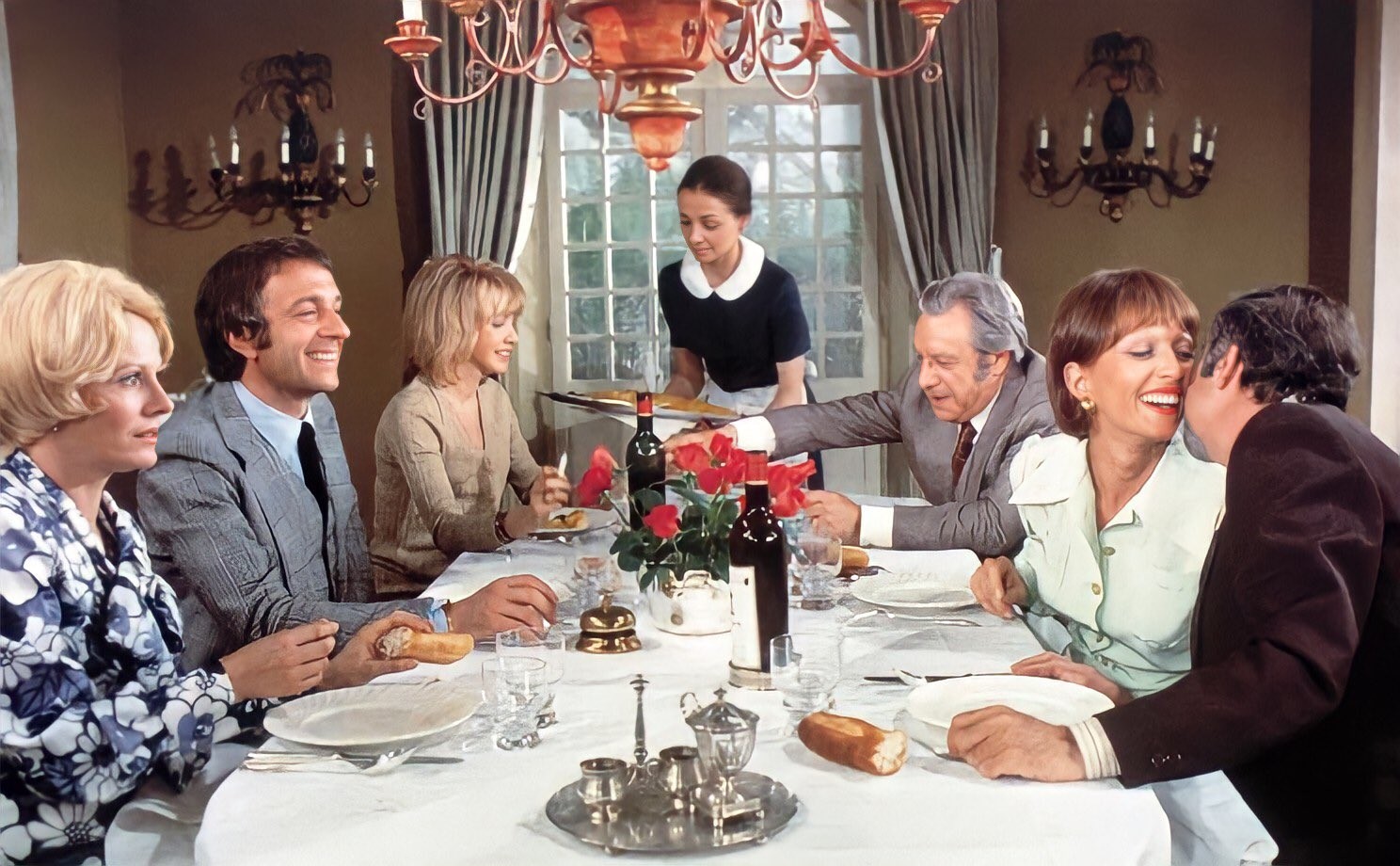 6人はどんな関係なのかが気にかかる。タイトルにあるようにブルジョワ階級に属するが、麻薬の密売に手を染めているようでもある。夫たちはそれなりに歳を食っているが、それに比べて妻たちは若い。他人の妻に手を出している不届き者もいる。整合性を求めたとき一番合理的な解釈は、女たちが三姉妹だと考えることだろう。この6人が長い路を歩き続ける場面が何度となく続く。女たちはハイヒールで歩きにくそうなので、なぜ車にも乗らずに歩き続けているのかが不可解だが、印象的な映像となって脳裏に定着している。