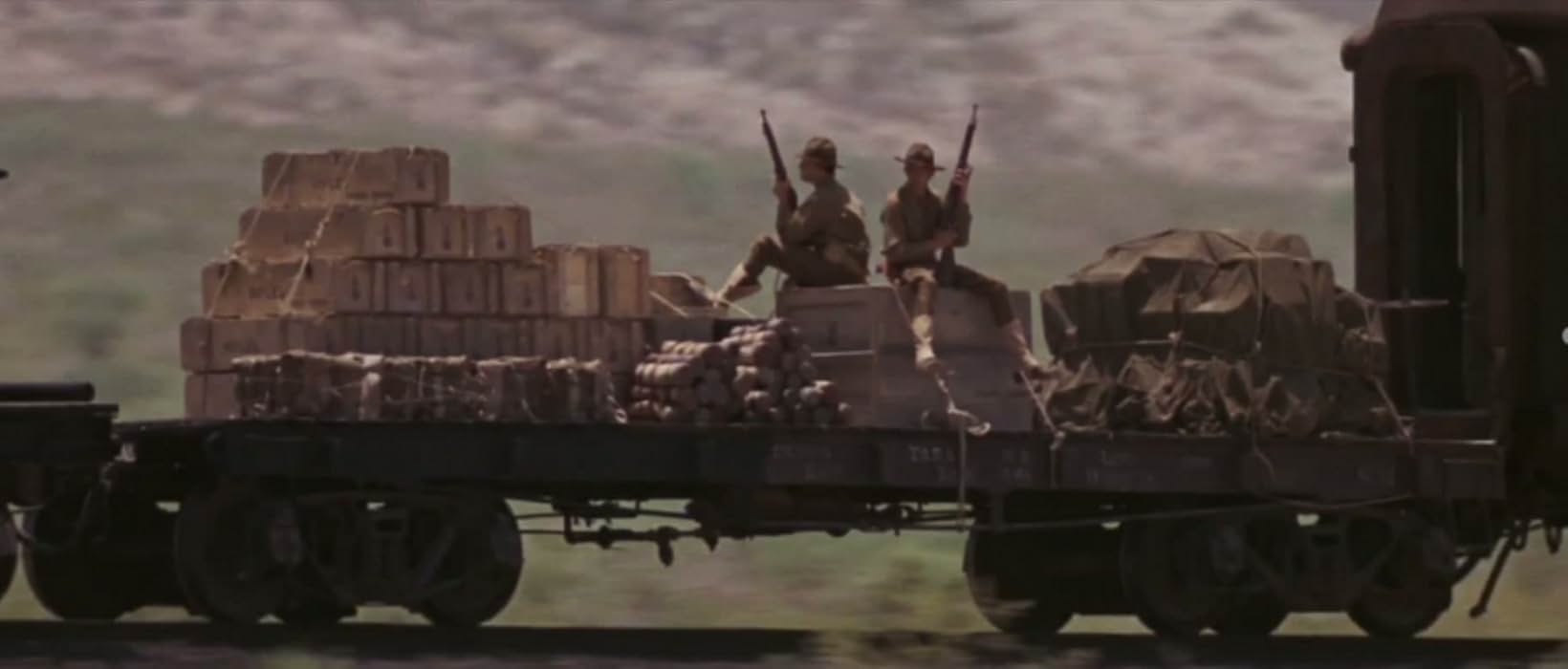 逃亡中に急に馬が砂地に足を取られ、全員が滑り落ちてしまう事故が起こると、若いメンバーが腹を立てて仲間割れを起こしている。強奪の失敗から引き起こされたいらだちだった。メキシコとの国境近くにまで逃げのびる。そこで最後の仕事として、ボスが選んだのは列車強盗だった。巧妙に仕組んだ手で、列車に積まれていた武器を手に入れる。箱詰めのなかを開けると銃だけでなく、機関銃やダイナマイトも入っていた。ダイナマイトによる橋の爆破で、馬上の戦士たちが落ち込んでいくシーンも迫力に満ちている。