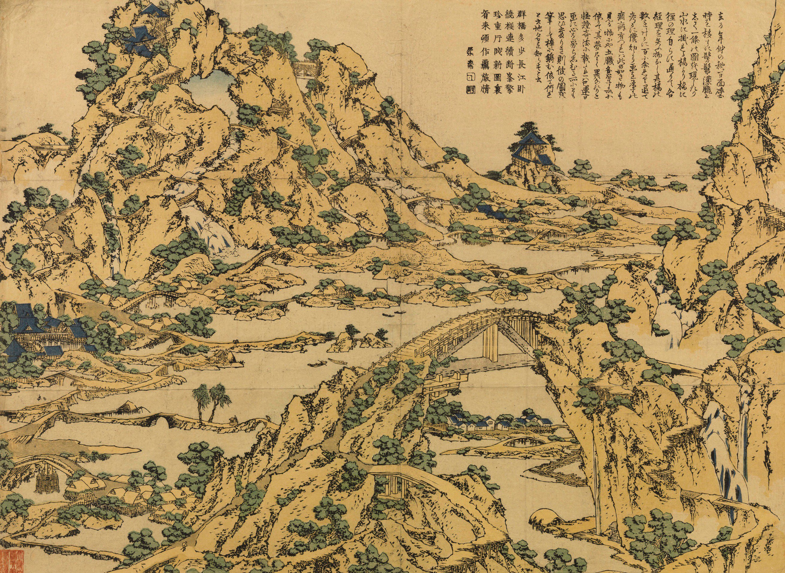 この木版画は富嶽三十六景を制作していた頃のもので、極めてサイズも大きく、そこに広がるパノラマ的な山岳風景は、ブリューゲル以降のネーデルラント版画に特有のもので、岩肌のマチエールは、17世紀前半のオランダ風景版画家セーヘルスが制作したエッチングに酷似する。ここで北斎はこの作品制作のいきさつを銘文に記しており、それによると秋のメランコリックな瞑想にふけっていた時、突然自分の前に百を越える橋が連なって道に結ばれる風景が現われ、その空想を素早く描きとめたのがこの作品だという(16)。確かに細かくディテールを追ってゆくと、橋は無限に結びあわされて、地図上で夢の旅をしている気分に等しい。ここでもまた百橋は大いなる連鎖であり、いわば「連の思想」(17)に裏打ちされたものといってよい。