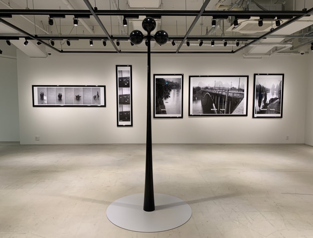 写真を使ったものもある。きっちりとした身なりの正社員ふうの男性が4人、ロンドを踊るようにパターンをなしている。スラブ舞曲に出てきそうな郷愁を誘う4体の姿勢がスナップとなっている。それぞれを結ぶ運動の軌跡は、見るほうの記憶にゆだねられるので、その解釈はさまざまだ。作者の葛西薫さんと私は同世代なので、たぶん同じダンスがイメージされているはずだ。受付の横には懐かしいファイターのシルエットが、大きく浮かび上がっていた。