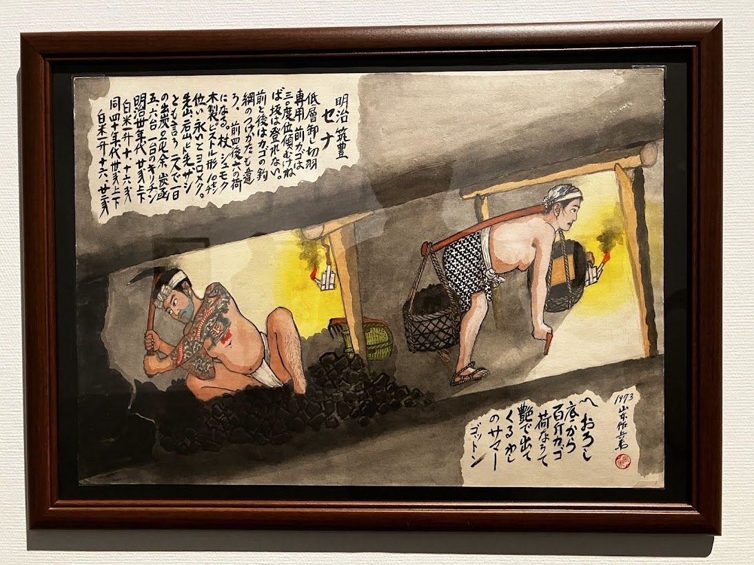 日本人作家の掘り起こしも、新人紹介と併せて、興味深いものがあった。日本の近代化を支えた炭坑内での労働風景を描いた、山本作兵衛の画集は、生々しい現実を伝える(3)。坑内にいるのは、入墨の入った男たちだけではない。
