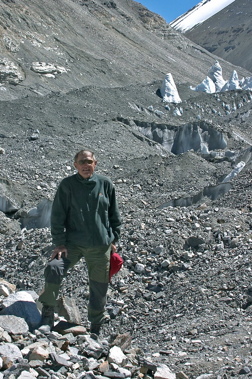 In de middag kwam Ton tevreden terug. Hij was op zijn gemak nog een paar honderd meter geklommen en had mooie foto's gemaakt van ons nietige kamp in de steenwildernis en de reusachtige gletsjer met de daaruit groeiende ijstorens of seracs.
