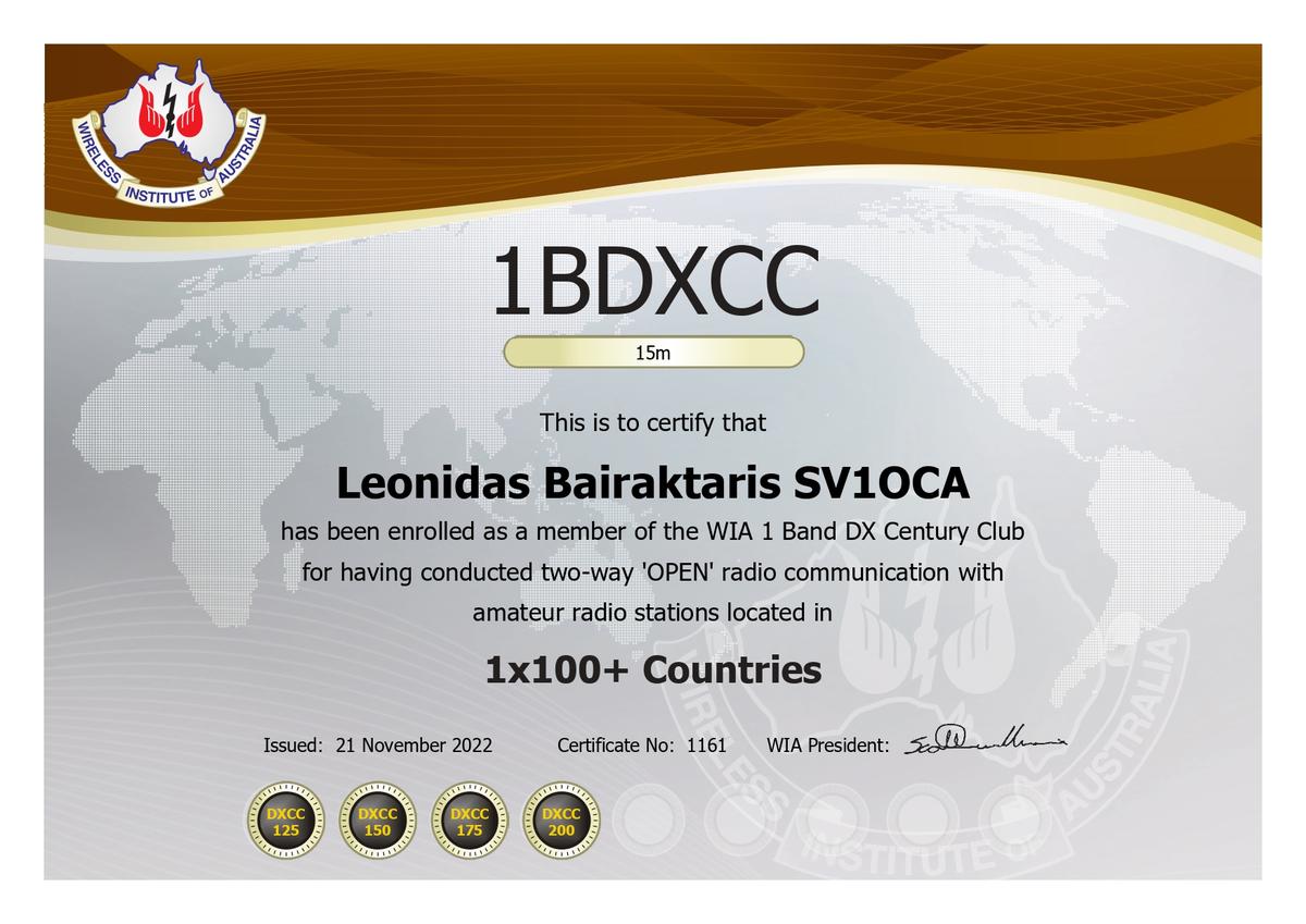WIA - 1 Band DX Century Club Award 15m - 200 DXCC, #1161 - 21.11.2022