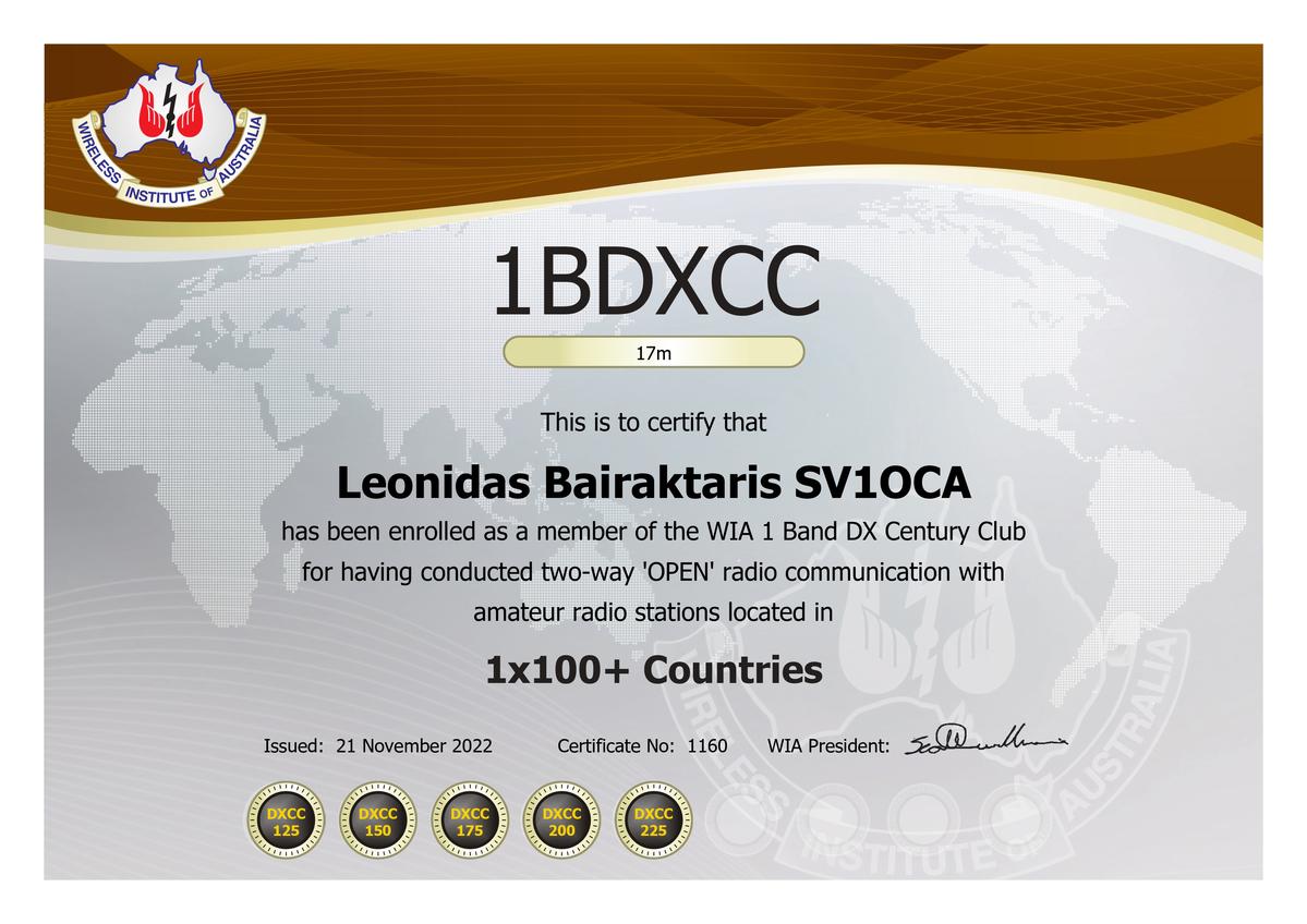 WIA - 1 Band DX Century Club Award 17m - 225 DXCC, #1160 - 21.11.2022