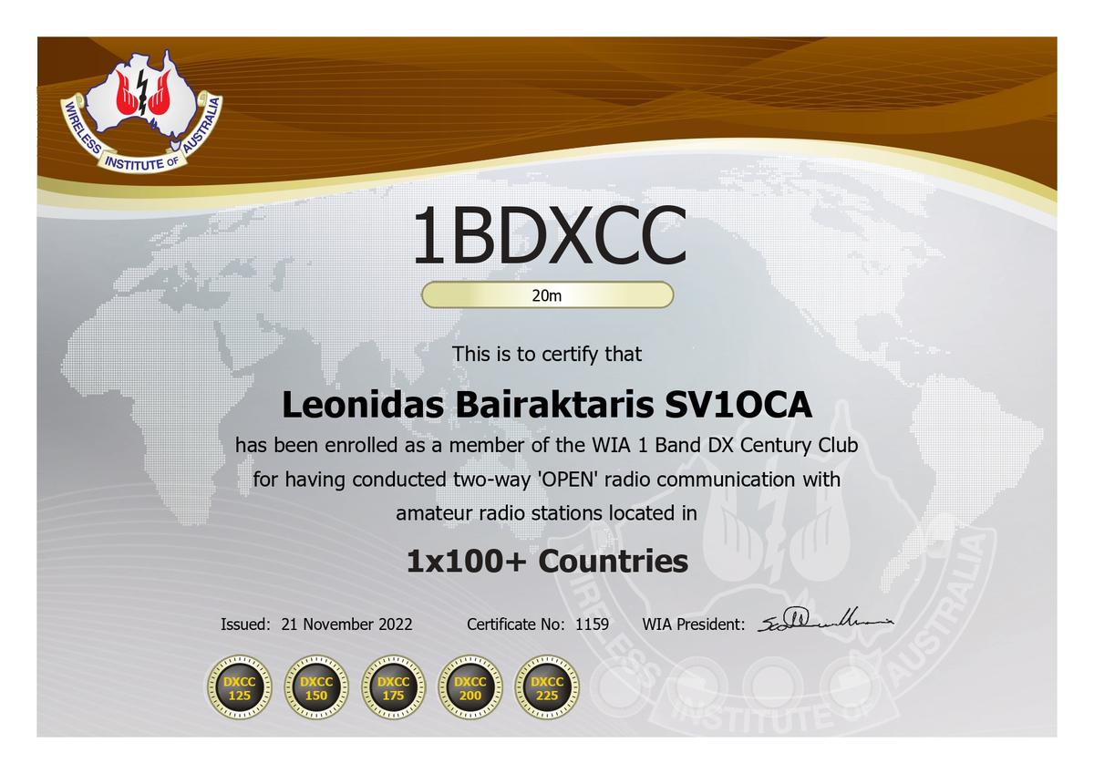 WIA - 1 Band DX Century Club Award 20m - 225 DXCC, #1159 - 21.11.2022