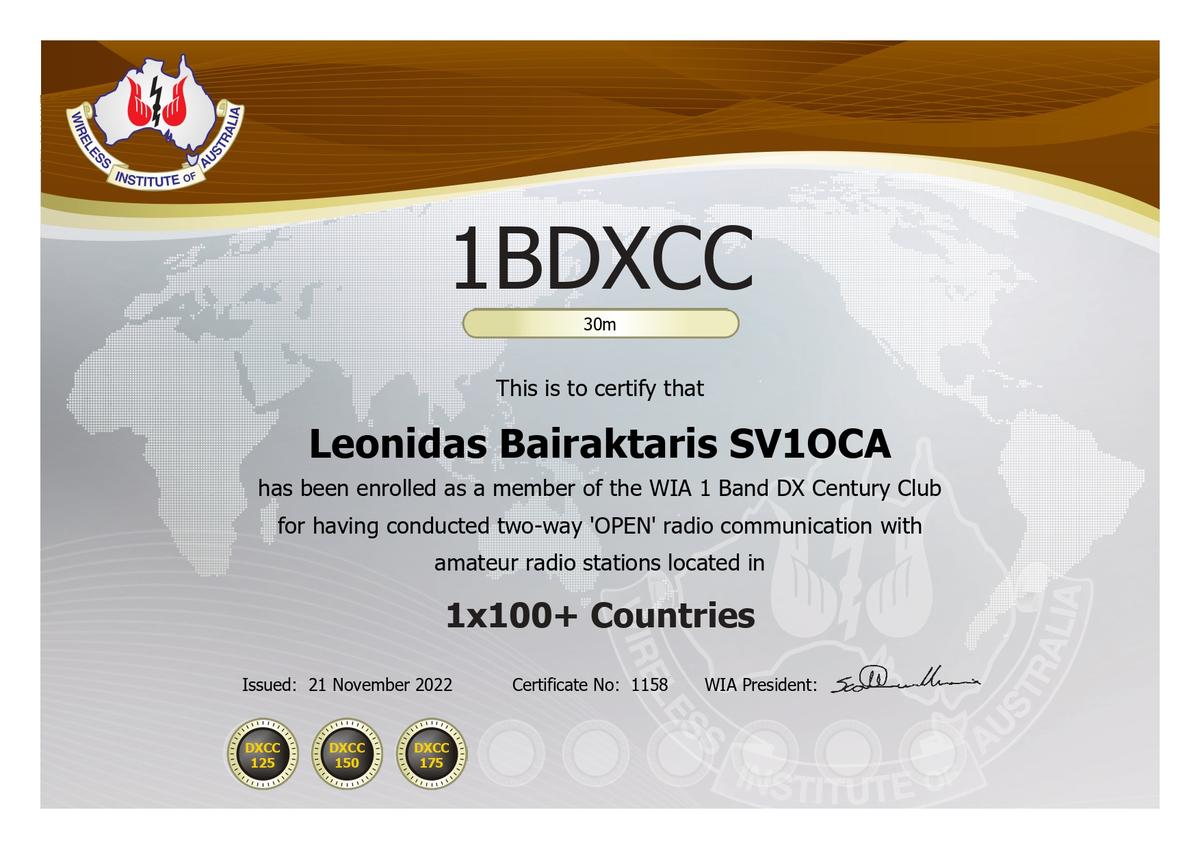 WIA - 1 Band DX Century Club Award 30m - 175 DXCC, #1158 - 21.11.2022