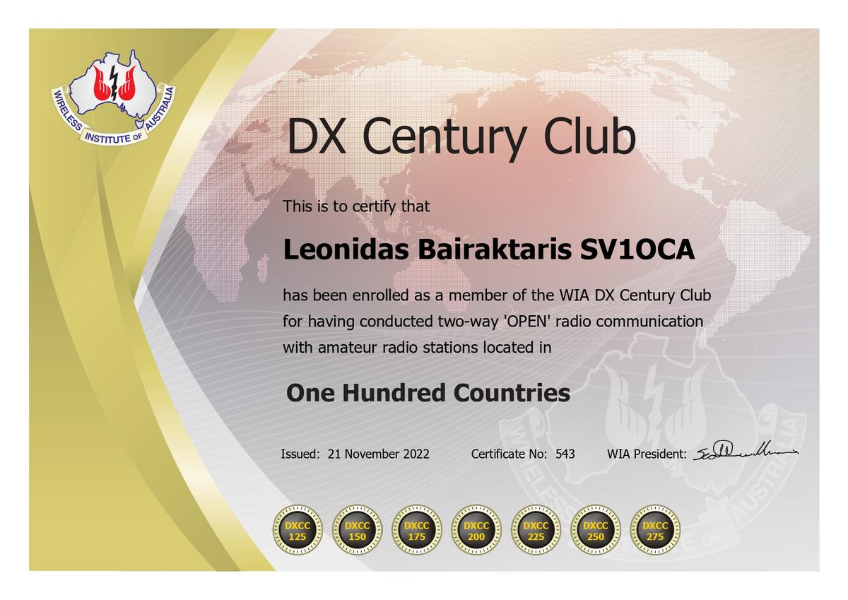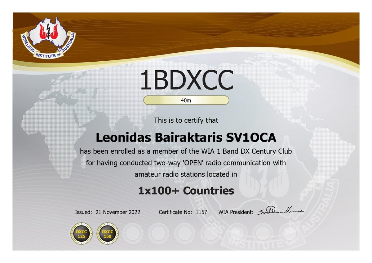 1BDXCC 40m (Open) - 163: 3ος στους εκτός Αυστραλίας (DXs), 3ος στην Ευρώπη και 1ος στην Ελλάδα σύμφωνα με WIA DX Awards Standings Lists: