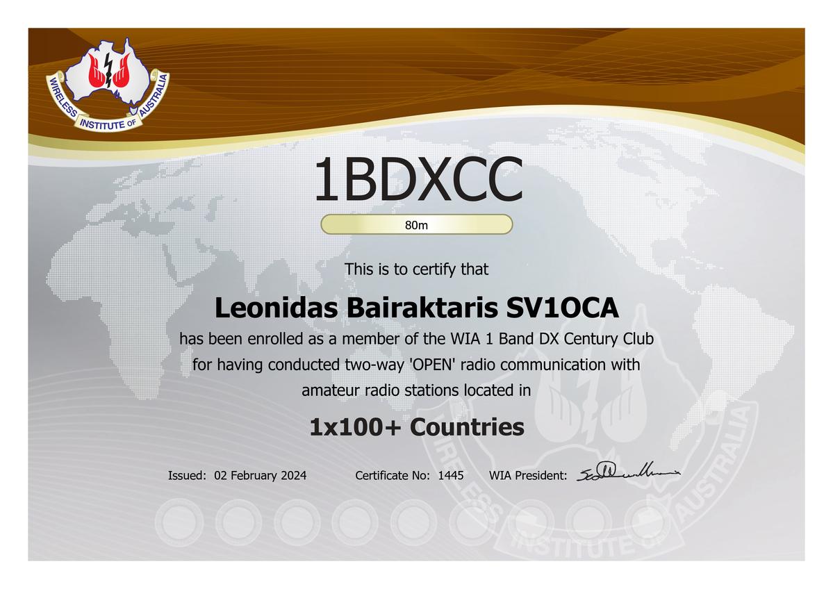 1BDXCC 80m (Open) - 101: 3ος στους εκτός Αυστραλίας (DXs), 3ος στην Ευρώπη και 1ος στην Ελλάδα σύμφωνα με WIA DX Awards Standings Lists: