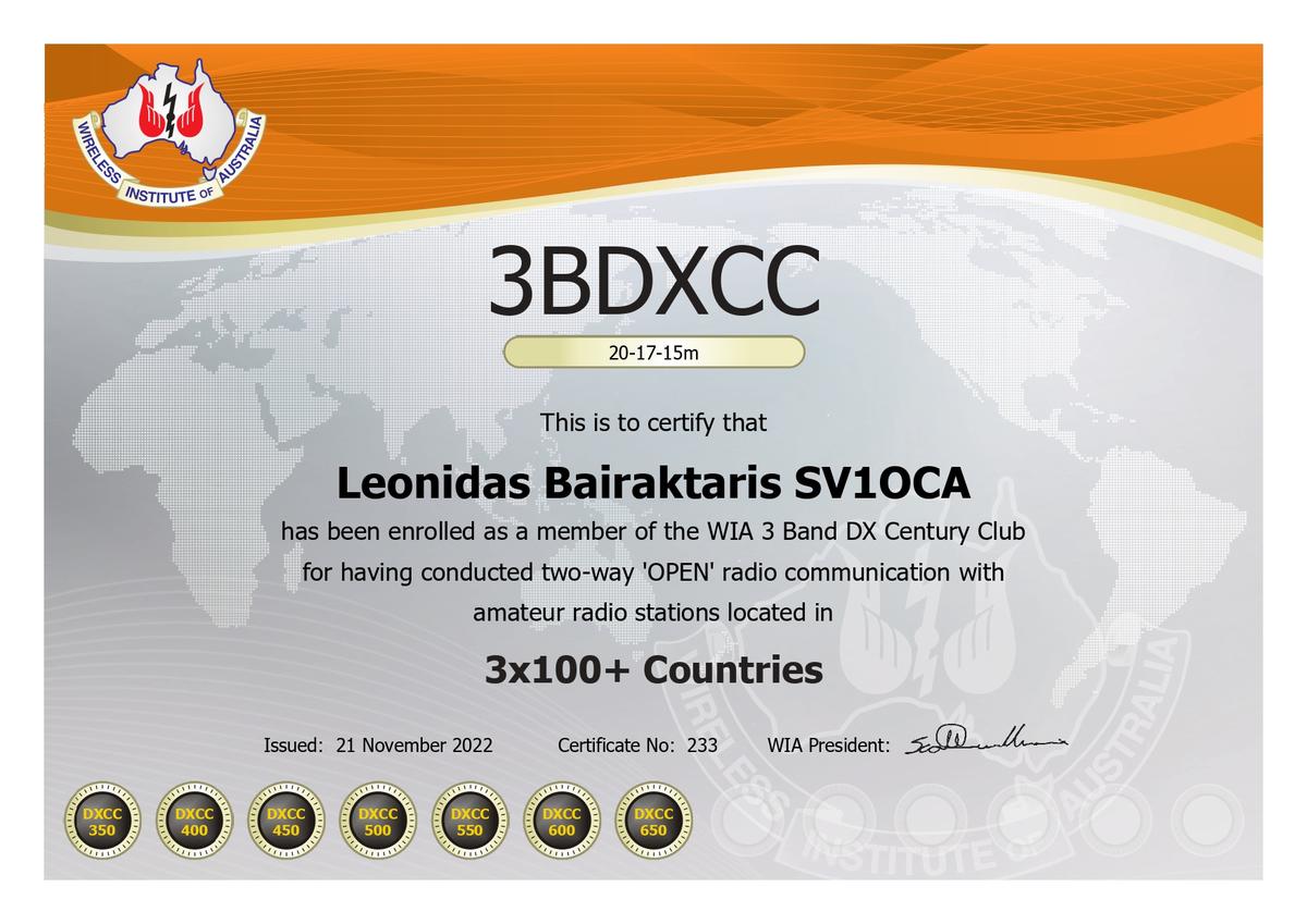 3BDXCC (Open) - 697: 3rd outside Australia (DXs), 3rd in Europe, and 1st in Greece according to WIA DX Awards Standings Lists: (Norway: 01, Germany: 01, Greece: 01).
