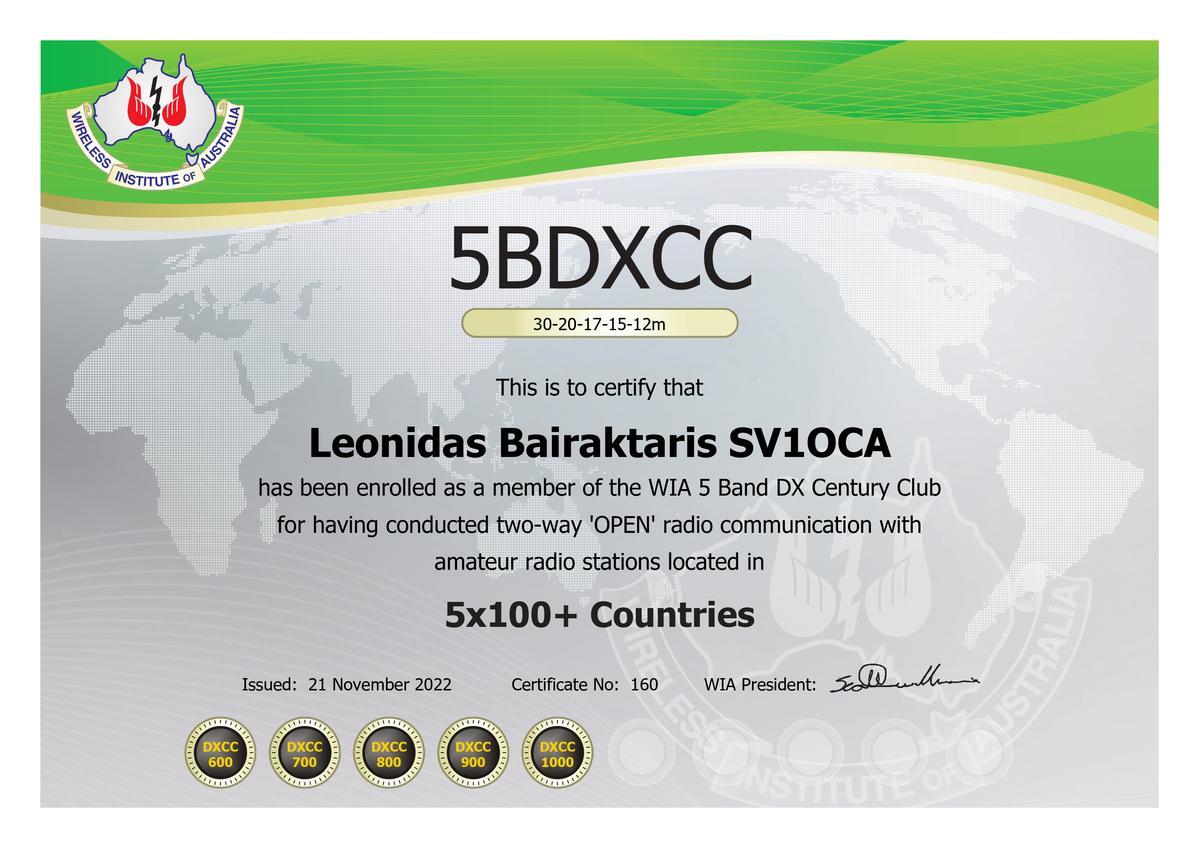 5BDXCC (Open) - 1067: 5ος στους εκτός Αυστραλίας (DXs), 5ος στην Ευρώπη και 1ος στην Ελλάδα σύμφωνα με WIA DX Awards Standings Lists: