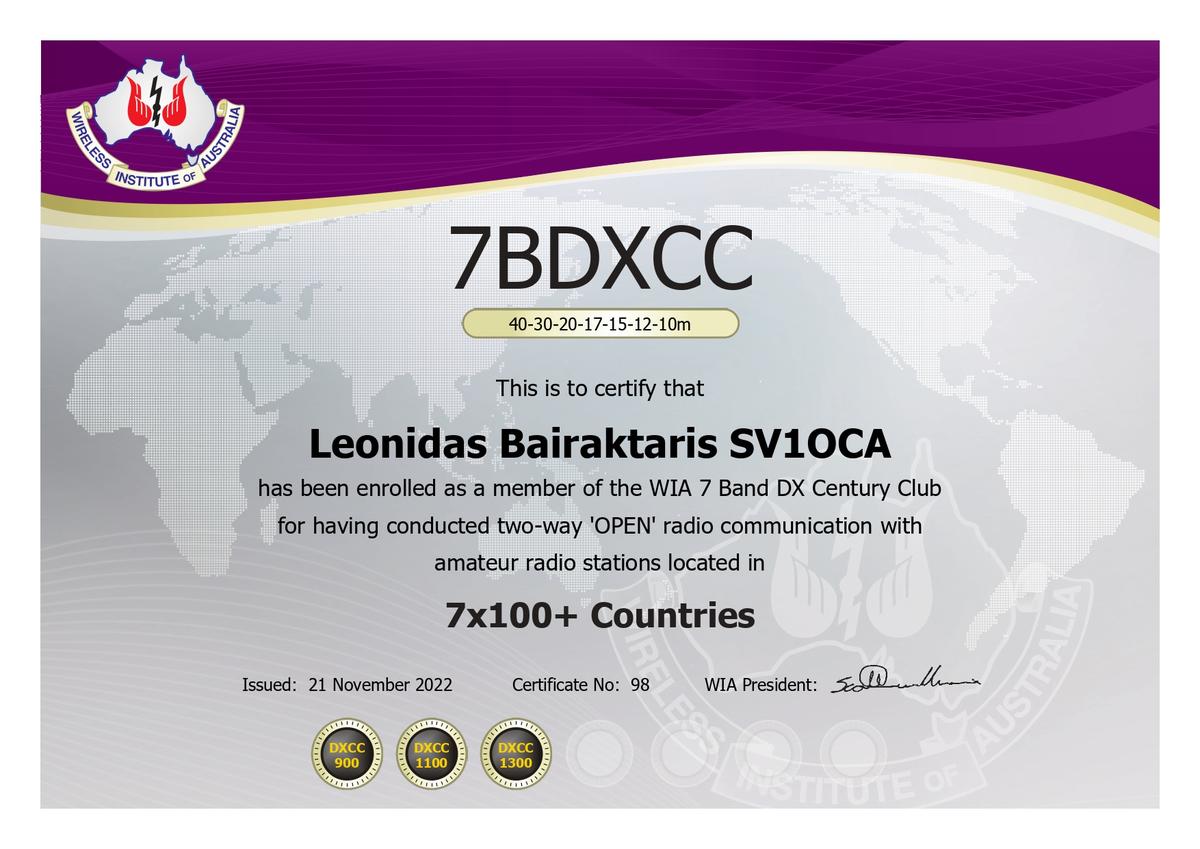 7BDXCC (Open) - 1403: 4ος στους εκτός Αυστραλίας (DXs), 4ος στην Ευρώπη και 1ος στην Ελλάδα σύμφωνα με WIA DX Awards Standings Lists: