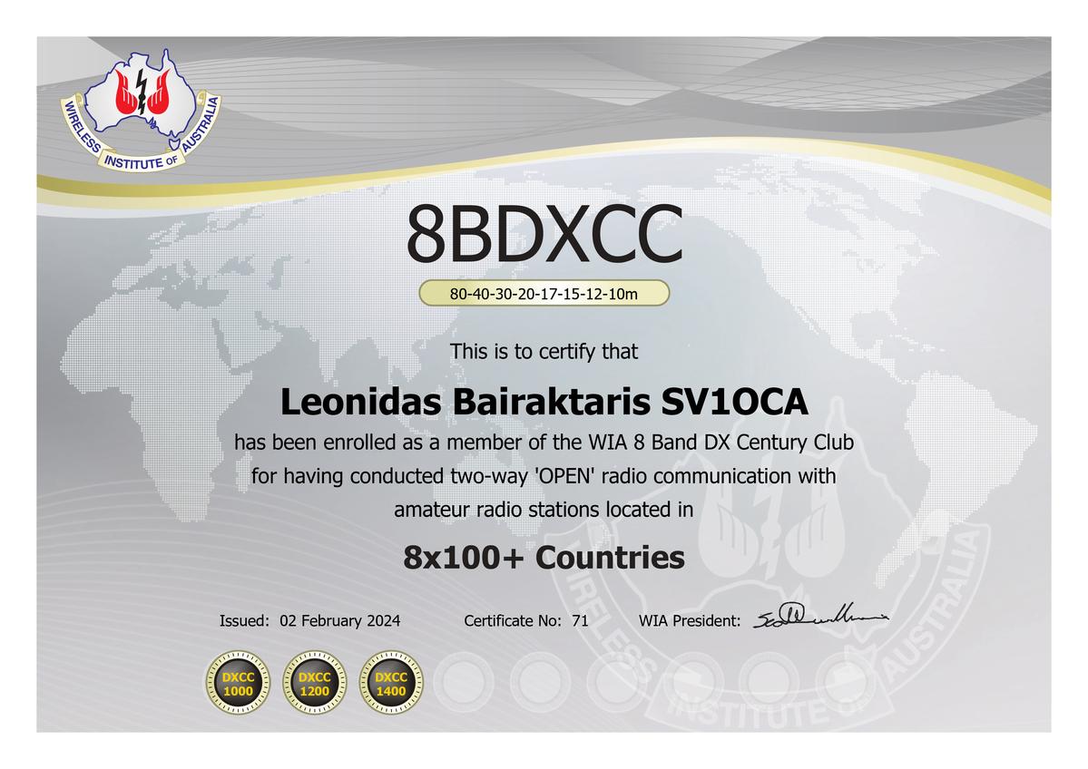 8BDXCC (Open) - 1504: 4ος στους εκτός Αυστραλίας (DXs), 4ος στην Ευρώπη και 1ος στην Ελλάδα σύμφωνα με WIA DX Awards Standings Lists: