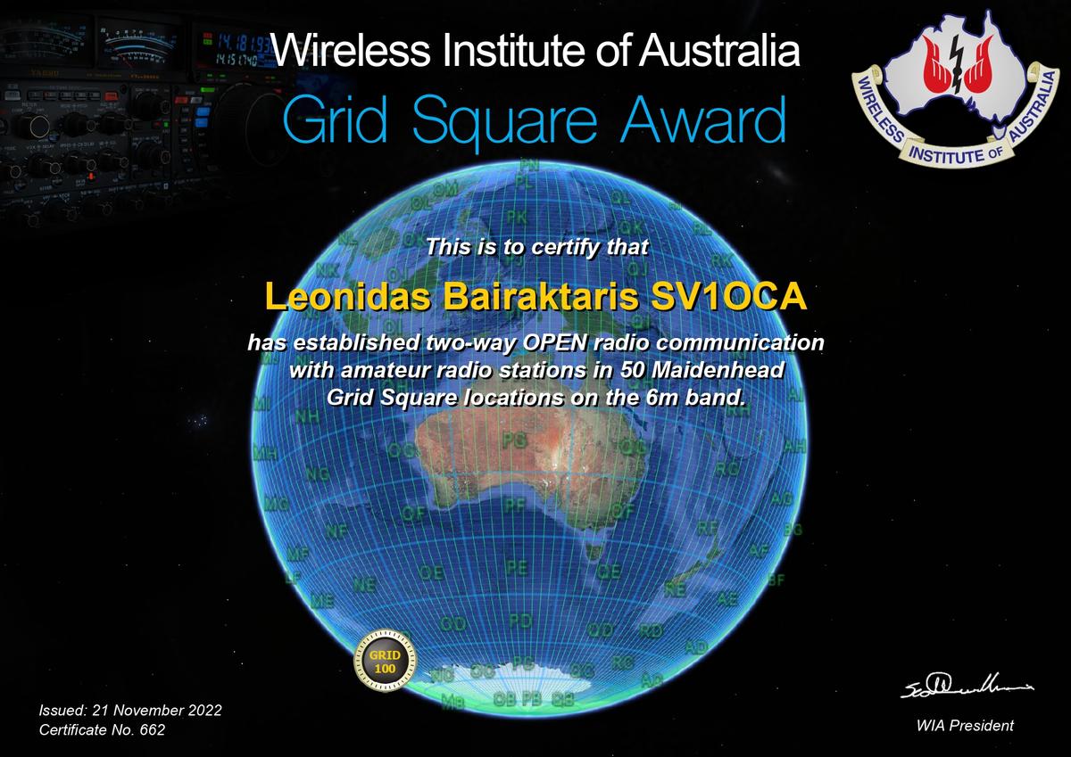 Grid Square 6m (Open) - 168: 4ος στους εκτός Αυστραλίας (DXs), 4ος στην Ευρώπη και 1ος στην Ελλάδα σύμφωνα με WIA DX Awards Standings Lists: