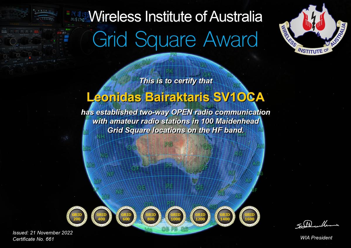 Grid Square HF (Open) - 1795: 1ος στους εκτός Αυστραλίας (DXs), 1ος στην Ευρώπη και 1ος στην Ελλάδα σύμφωνα με WIA DX Awards Standings Lists:
