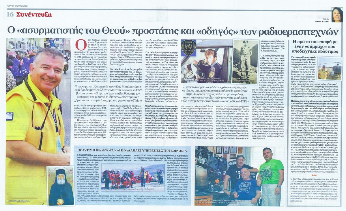 Εφημερίδα Ορθόδοξη ΑΛΗΘΕΙΑ, συνέντευξη SV1OCA - Λεωνίδας Μπαϊρακτάρης στη δημοσιογράφο Σοφία Χατζή για τον Ραδιοερασιτεχνισμό, Σελ. 16-17.