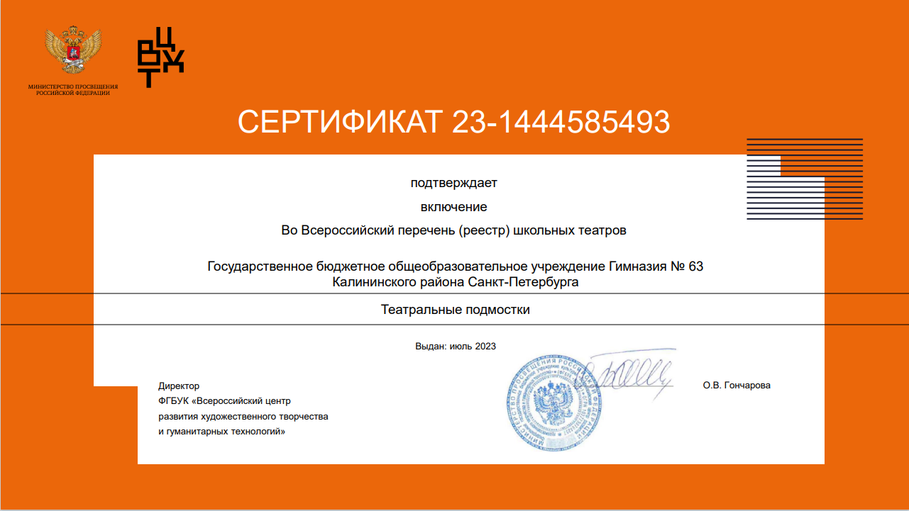 Сертификат о включении во Всероссийский реестр школьных театров.