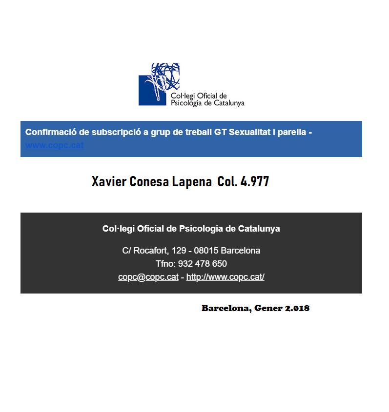 Membre del Col.legi Oficial de Psicòlegs de Catalunya