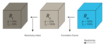 Schematic showing the two components of Archie’s law: formation factor and resistivity index. Formation factor is a relationship between 𝑅𝑜 and 𝑅𝑤, while resistivity index is a relationship between 𝑅𝑡 and 𝑅𝑜. 𝑅𝑜 is the common parameter between the two components .