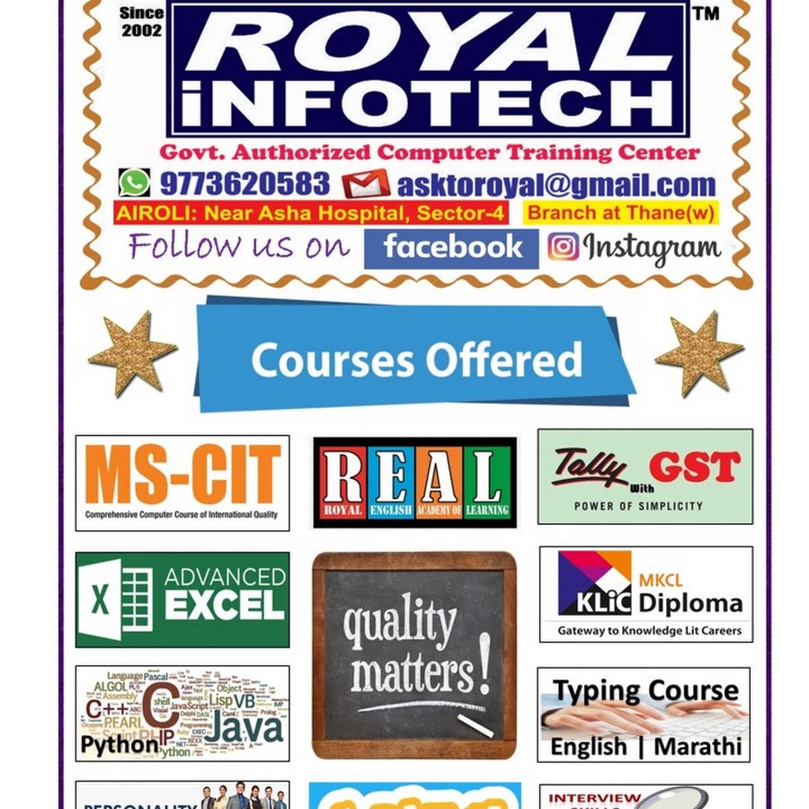 Hi Friends!! Welcome to ROYAL iNFOTECH We Provide You Quality Computer Education (Offline & Online both) If You Are Not Learning At ROYAL You Are Missing So Many Things (Tagline given by students) We conduct Computer courses as well as English Speaking classes. We are Govt. Authorised Computer Training Center. We started in the year 2002. * Computer Courses we offer are as follows: 1. MS-CIT (Govt. Course) Basic Computer Literacy 2. GST Tally (includes Accounting+Inventory+Taxation+Advance Uses) 3. Advance Excel (including VBA) 4. AutoCAD 5. Computer Programming ('C'/C++/Java/Python/.NET) 6. Banking Financial Services & Insurance (BFSI) 7. Retail Management (Be ready to work in D-Mart/Jio-Mart/Big Bazaar/Star Bazaar etc) 8. Cyber Security (Learn about preventing from Cyber Attacks) 9. Digital Freelancing (Be a Digital Freelancer) 10. Mobile App Development 11. Scratch Programming for School Students *English Speaking Course 1. Schools Kids 2. Housewives 3. Working Professional