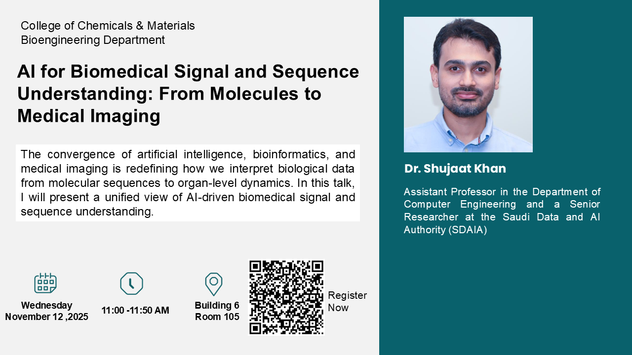 - "AI for Biomedical Signal and Sequence Understanding: From Molecules to Medical Imaging" Invited talk at Bioengineering Department, KFUPM, Dhahran, Kingdom of Saudi Arabia (Feb. 2026).