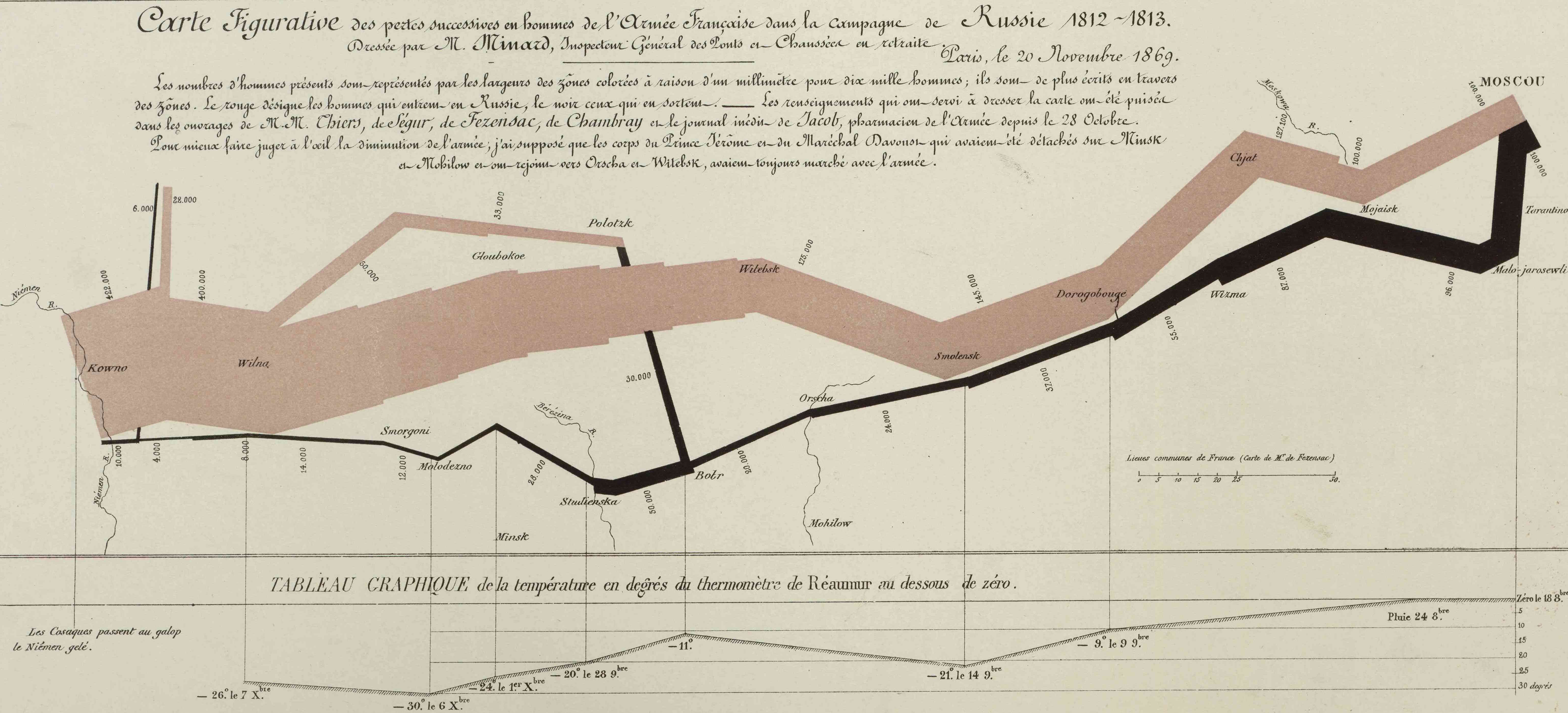 Created by Charles Minard in 1869 to tell a story of the losses of Napoleon’s troops on their 1812 march to Moscow, this data visualization is regarded as one of the greatest data visualizations of all time. It consists of six variables: the size, location, distance, and direction of the army, dates of travel on the return trip, and changing temperatures on the return trip. The visualization shows how disastrous the trip was, largely because of the great distance traveled in subzero temperatures. The size of the army was 422,000 men at the beginning of the trip and by the time the army completed the march, fewer than 10,000 men remained. One version of the original hand-drawn data visualization can be found here: https://www.nealvonflue.com/wp-content/uploads/2018/04/Minard-napolean-chart3.jpg