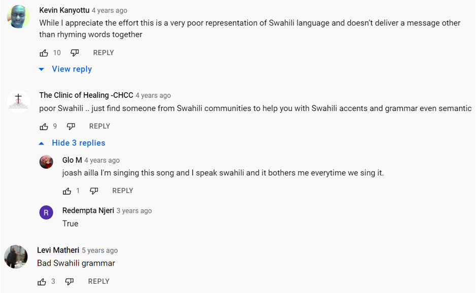 LANGUAGE: Please take great care to pronounce correctly. This song was not written by a native Swahili speaker, so it is advisable to check with local or online Swahili resources to ensure the syntax and pronunciation is correct. (While not necessarily reliable, comments on this YouTube video have noted this may be an issue: screenshot)