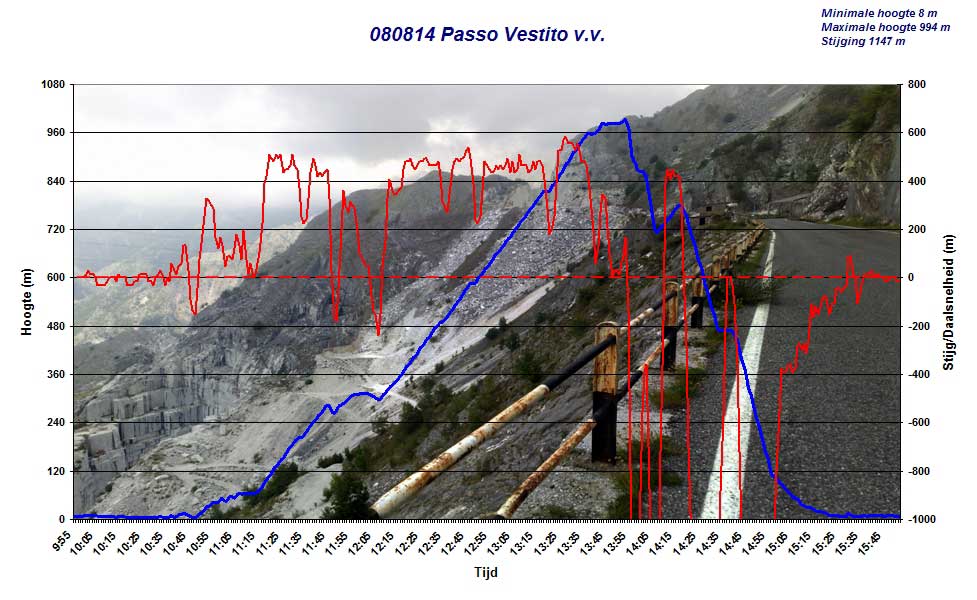 Om de Passo del Vestito op te komen moet letterlijk vanaf zeeniveau tot bijna 1100 m omhoog gefietst worden. Voor wat betreft het verzet geen punt maar wel het gewicht van de city bike. De klim is 20 km lang met gemiddeld ca 6% stijging. Dit zegt echter niets over de de steilere delen waar alles uit de kast gehaald moet worden.