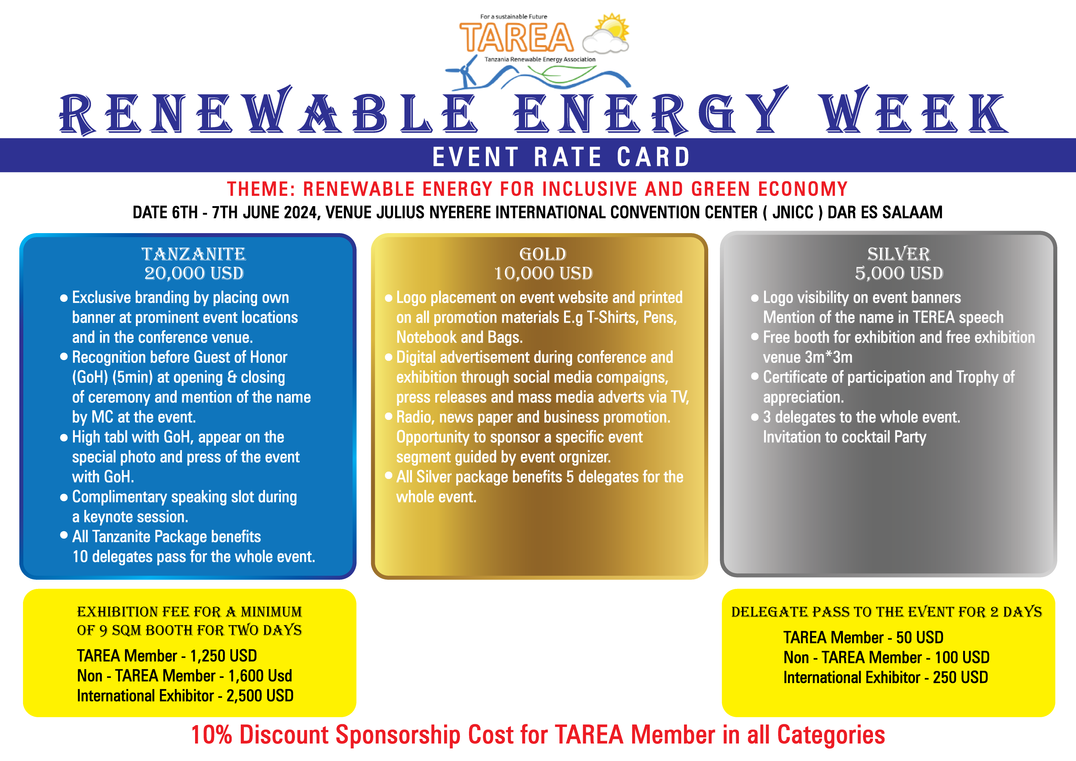 The Tanzania Renewable Energy Association (TAREA) is announcing the event of Renewable Energy Week (REW) for 2024 which will take place in Dar es Salaam, Tanzania. This event aims to provide a platform for the private and the public to explore Renewable Energy Technologies (RETs) showcased during the event. The event will be implemented in parallel with the European Sustainable Energy Cluster Partnership for Africa (ESECA) Business mission on the 4th and 5th of June in Dar es Salaam. REW will consist of exhibitions and workshops where participants will discuss key sectorial issues such as opportunities, challenges, and emerging renewable energy technologies. The event will occur at the Julius Nyerere International Convention Centre (JNICC) in Dar es Salaam.