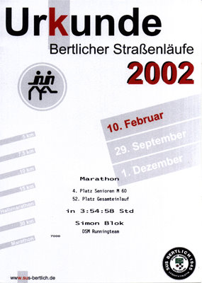 Jean en Jos V., zo hoorde ik, gaan de 6 h. van Stein lopen. Van Jean begrijp ik dat want die moet nu, samen met Ivo en nog voor Edwin, Rotterdam ruim binnen de 3 h. kunnen lopen. De aanpak van Jos V. is minder begrijpelijk. Hij loopt kennelijk eerst de 6 h. om te kijken of hij zijn eerste marathon wel kan volbrengen. Overigens lijkt Stein mij zeer ellendig want de rondjes zijn zo kort dat je net zo goed in een misselijk makende tredmolen kan gaan lopen. Ik spreek hierbij niet over het gegeven dat je zeker elk uur driemaal dezelfde Steinse gezichten weer in je blikveld voorbij ziet schuiven.