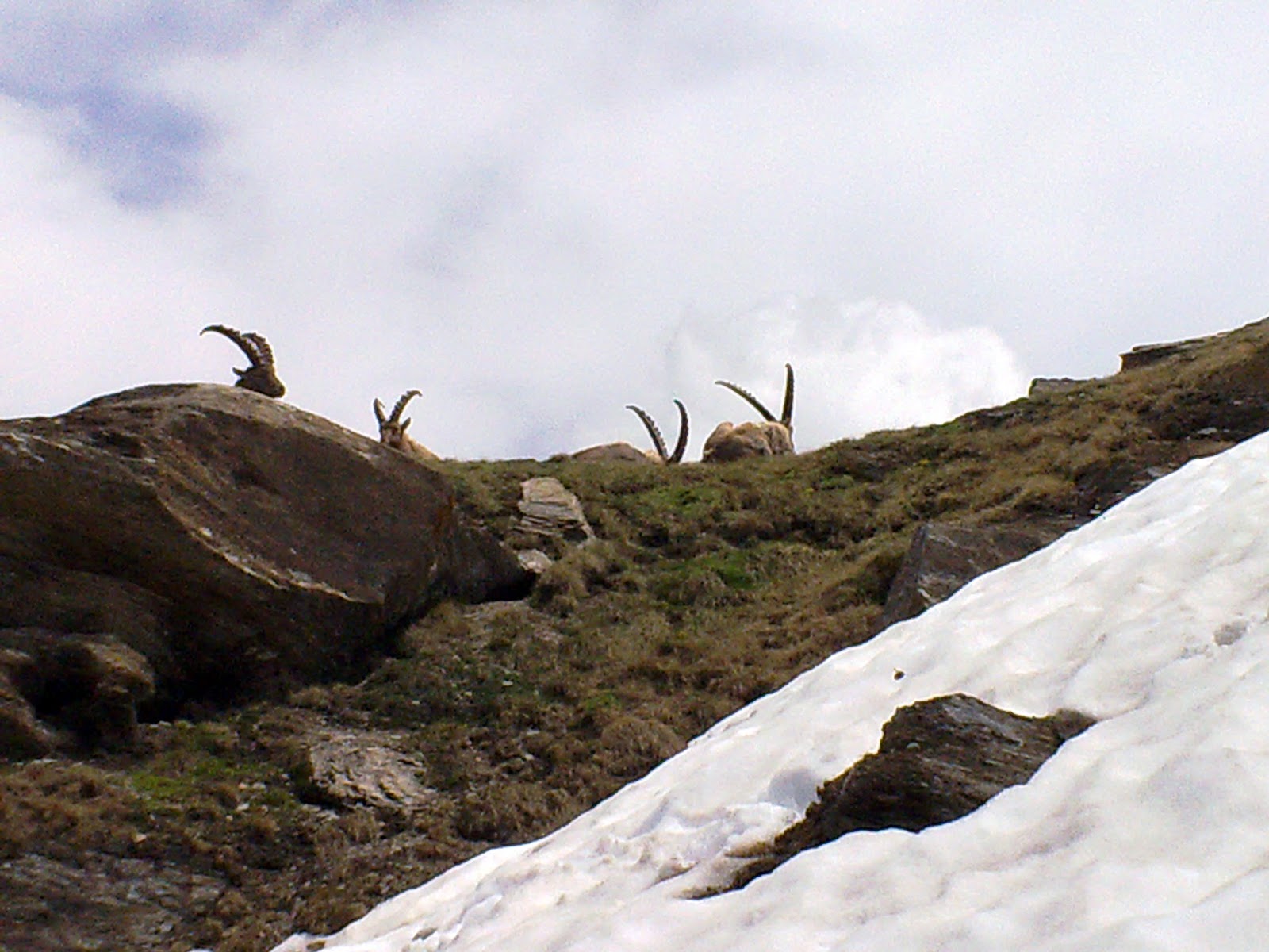 De fauna werd niet gemist. Steenbokken, gemzen, herten, vossen, bergmarmotten en natuurlijk de onvervalste bergkoeien stoffeerden ons pad. Het toppunt van deze ontmoetingen was een steenbok die op een golfplaat van een ingestorte almhut rustig lag te zonnen. De steenbokken bleken zonder opjagen goed te benaderen.