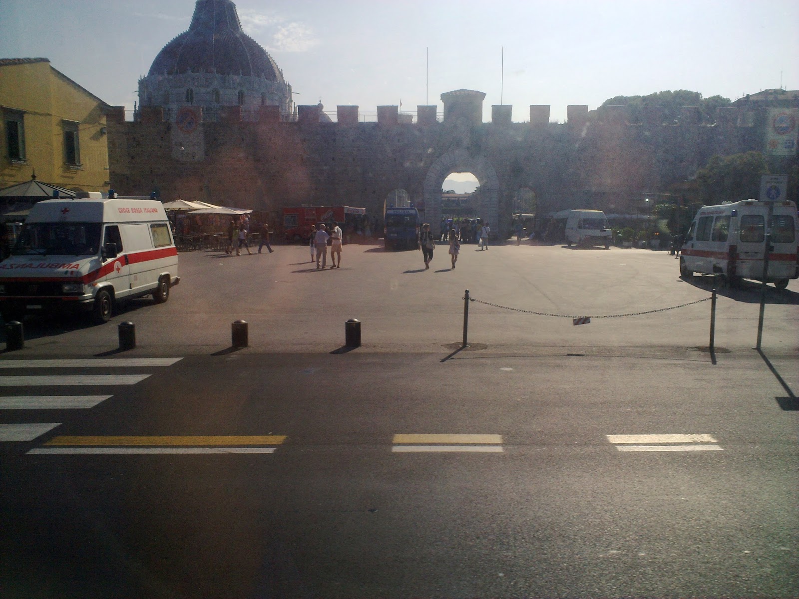 De terugweg begon goed met de lijnbus van Vareggio naar het vliegveld Galileo van Pisa. Een leuke rit die ook nog even het centrum van Pisa aandoet. In de vroege ochtend stond de ambulance al paraat om de oververhitte toeristen af te voeren. Door de poort zag ik nog net dat het geen luxe was want op het terrein van de Torre Pendente di Pisa kon al over de hoofden gelopen worden.