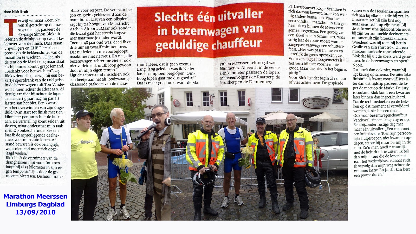 Ondanks de af en toe neerplenzende regen werd het niet alleen een aangename en maar ook bijzondere loop. Aangenaam omdat het been bleef staan en de pijn niet onverdraaglijk werd. Zodoende werd de afstand zonder inzinkingen en zonder bijzondere moeite overbrugd. Bijzonder omdat ik voor het eerst in mijn leven als laatste ben aangekomen. Ik kan dat iedereen aanraden. Met drie motormoutards, de bezemwagen en de meerijdende verslaggever van de het Limburgs Dagblad kwam ik met veel getoerter over de finish terwijl Radio Limburg "Congratulations" voor mij speelde als intro voor een interview in de directe uitzending. Bovendien bijzonder omdat ik samen met de verslaggever veel geleerd heb over het gebeuren achterin. Het Limburgs Dagblad bleek namelijk een item te maken over dit onderwerp en ik mocht als debutant al lopende mijn bevindingen vertellen.
