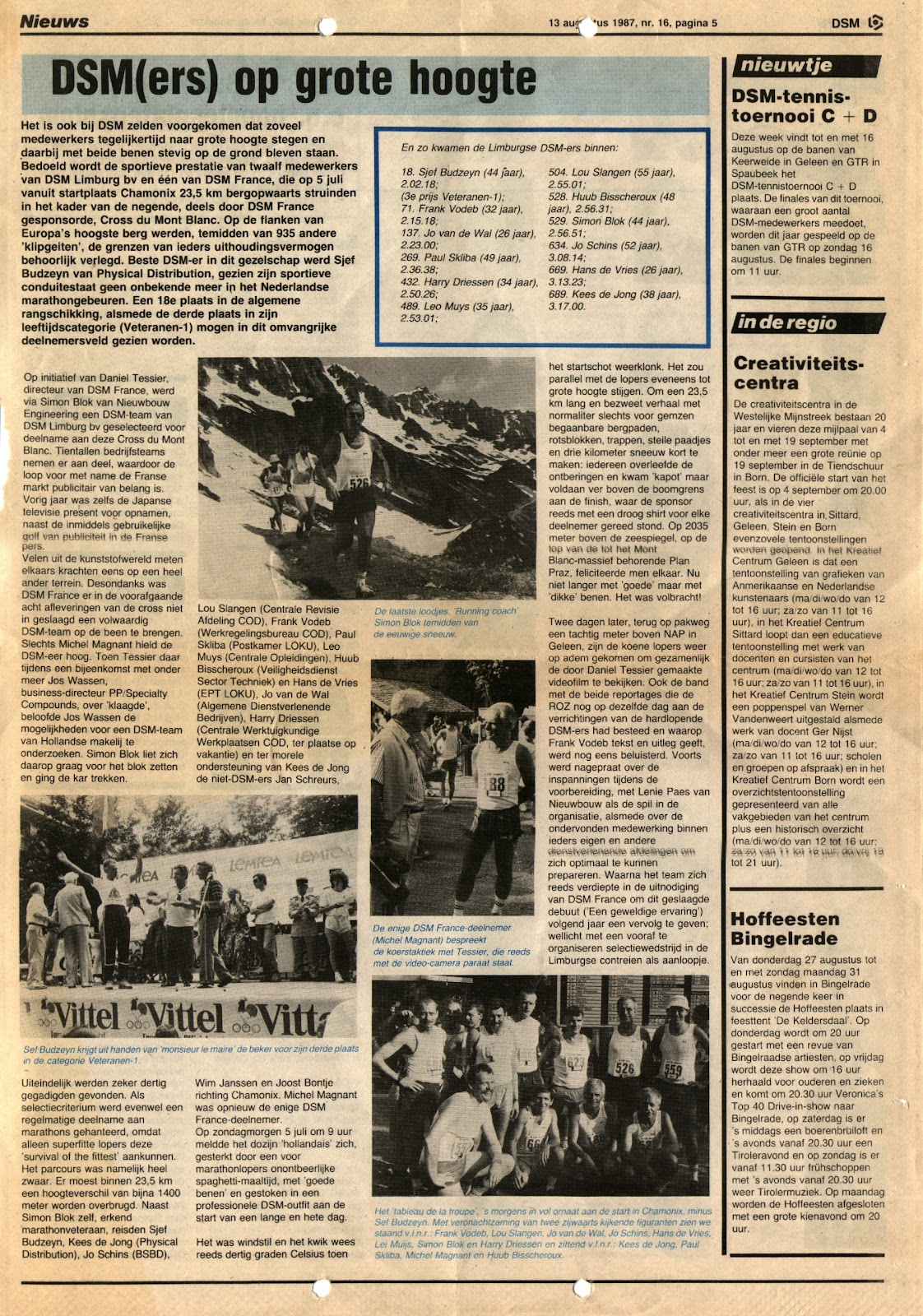 De verwerking van dit gebeuren heeft even tijd nodig gehad. Al sind 1987 dribbel ik entousiast de flanken van de Mont Blanc op. Eerst in de Cross du Mont Blanc van 23 km en de laatste 5 jaar in de Mont Blanc Marathon. Alles bij elkaar heb ik daar meer dan 30.000 m geklommen en zo'n 12.000 m afgedaald. Een deel van het leven zogezegd.