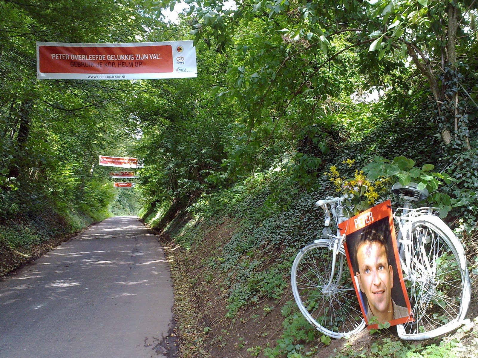De Eyserbosch is niet al te breed. Toch scheuren auto's, motoren en bergaf rijdende fietsers net als in heel ZuidLimburg als gekken. 's Zondags en in de vakantietijd zijn de Mergellandwegen uit veiligheidsoverwegingen maar helemaal te mijden. Naar het racen kraait geen haan want het "Blauw" op de Zuid Limburgse wegen is een nagenoeg uitgestorven soort. Om dit te ondervangen heeft de een of andere gesubsidieerde club weer een ludieke actie bedacht in de vorm van waarschuwende kunstwerken langs de weg. Op zich nutteloos want opvoeden zonder sancties heeft nog nooit gewerkt. Het enige effect voor mij was een aardig plaatje.