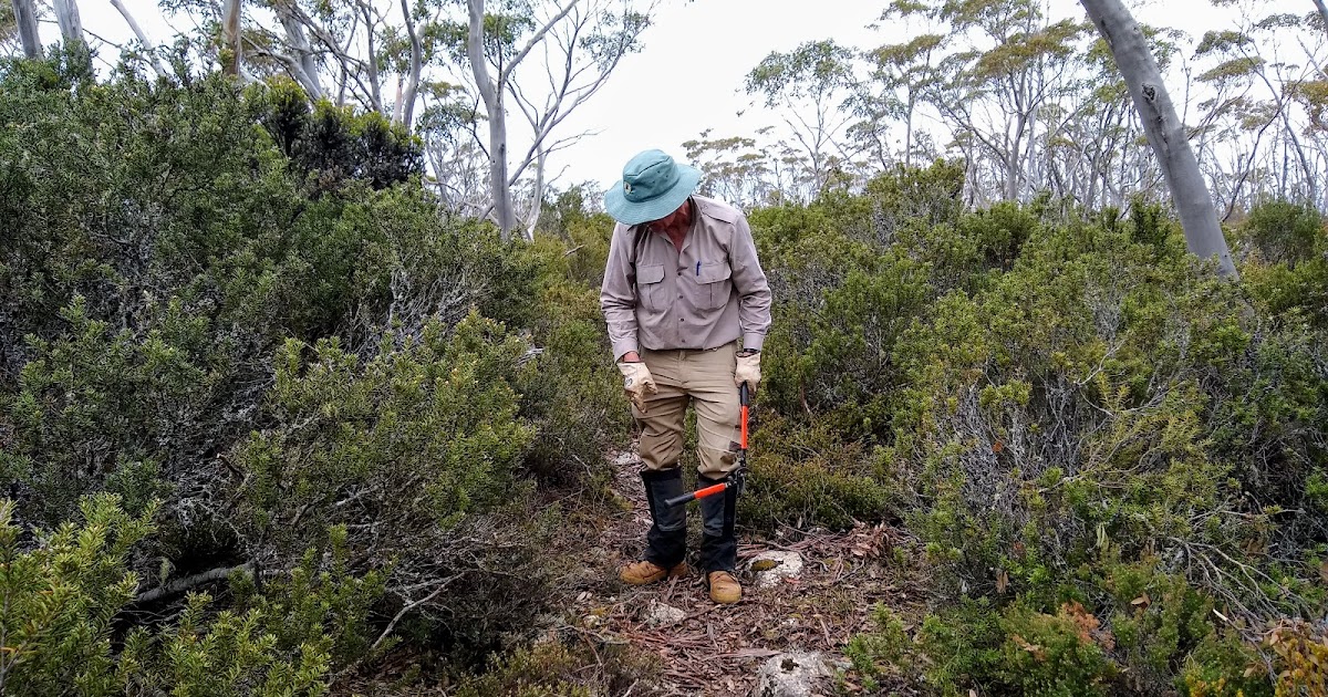 The new section of track was planned to be 800 metres in length, a daunting task for volunteers to construct. The undertaking was made more difficult since the site is about 1100 metres in elevation and it takes a little over one hour to walk there (tools had to be carried too!). Work commenced in February 2017 and was completed four months later in mid June. Towards the end of this time the winter weather became a problem in selecting suitable visiting times and occasionally there were small patches of snow on the ground while working. A total of five days were spent building the new section of track. Volunteers from both the Friends of Wellington Park (who are also Wildcare members) and the RAMBOs walking group contributed many hours to the project with Peter’s enthusiastic coordination. Parks and Wildlife personnel took an overall supervisory role and also helped with the construction several times.